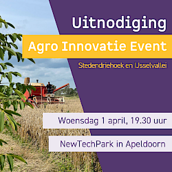 Voor het Agro Innovatie Event op woensdagavond 1 april. Het wordt een energieke avond met inspirerende praktijkverhalen op het podium en het Innovatieplein om bij te praten en je ideeën te delen. Je gaat gegarandeerd met nieuwe contacten en ideeën naar huis